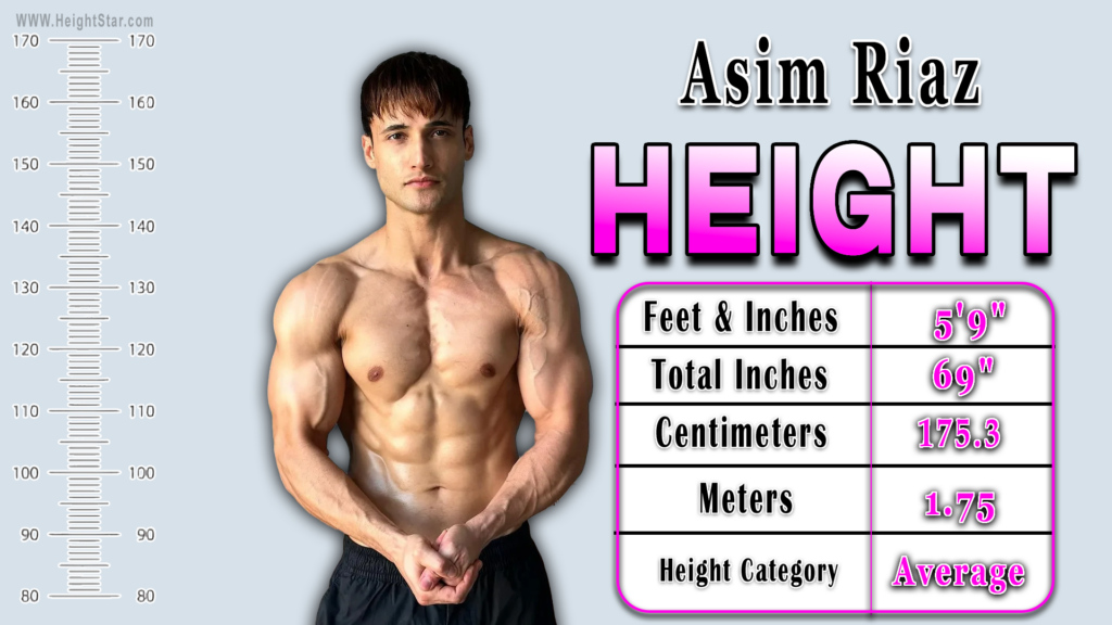 Asim Riaz is a model, actor, and reality TV star. He gained fame after Bigg Boss 13 and later appeared in popular music videos. His strong style and fitness made him a fan favorite. His official listed height is around 5’9″ (175.3 cm), though he may appear slightly shorter in real life without shoes. His lean body and confident posture make him look taller on screen. Height is just a number, but his presence makes a strong impact.