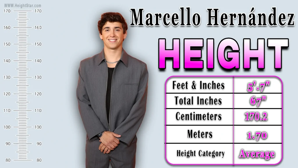 According to IMDb , Marcello Hernández is listed at 5′7″ (1.70 m). At age 28, most men have already reached their full adult height.